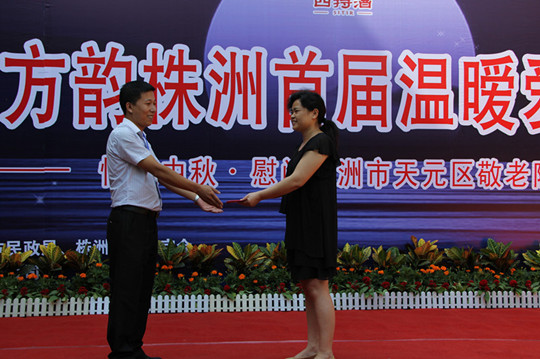 株洲辦經理林劍代表四特酒公司為敬老院的爺爺/奶奶們送上中秋月餅及慰問金